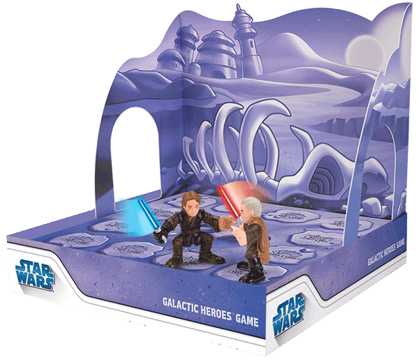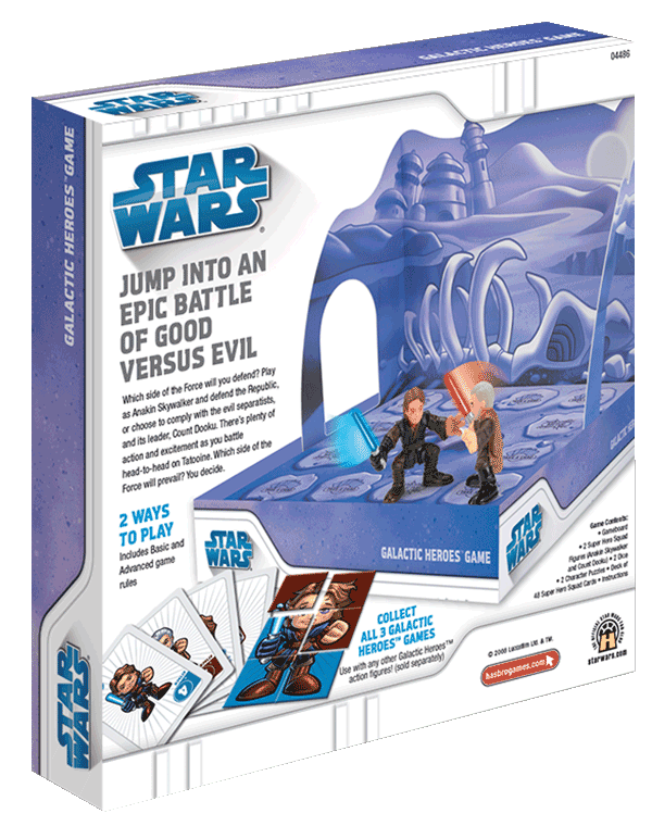 As part of our work with Hasbro, we were asked to develop three SKUs for a Star Wars licensed product line. Our role included package design, artwork, illustration, product instructions, and card design. A key feature on the back of each package was an image showing the game in use. This visual was especially important because the box insert functioned as both the game board and a pop-up background. The challenge was that the product had not yet been manufactured, and no working prototype was available to photograph.